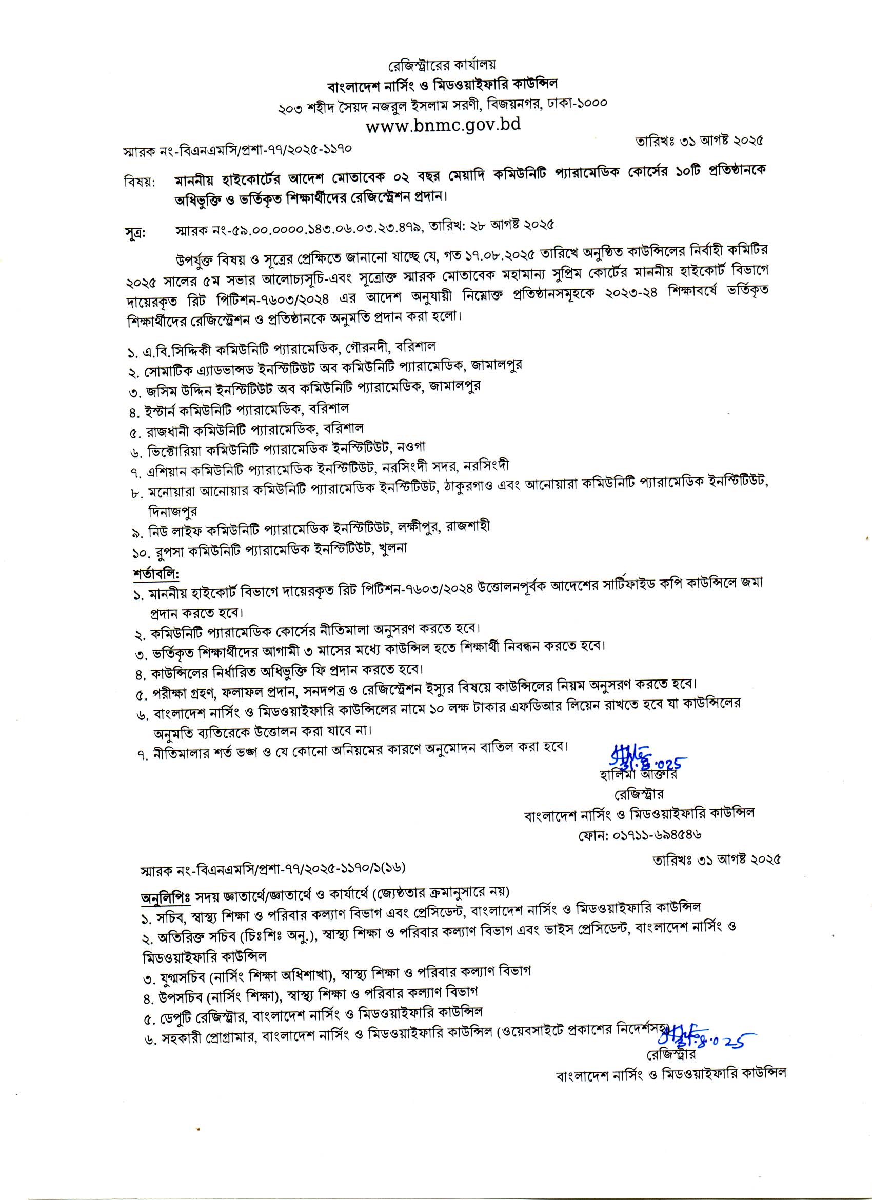 | ১ | ০২ বছর মেয়াদি কমিউনিটি প্যারামেডিক কোর্সের ১০ টি প্রতিষ্ঠান অনুমোদন সংক্রান্ত | 1170 | ৩১-০৮-২০২৫ | দেখুন | |