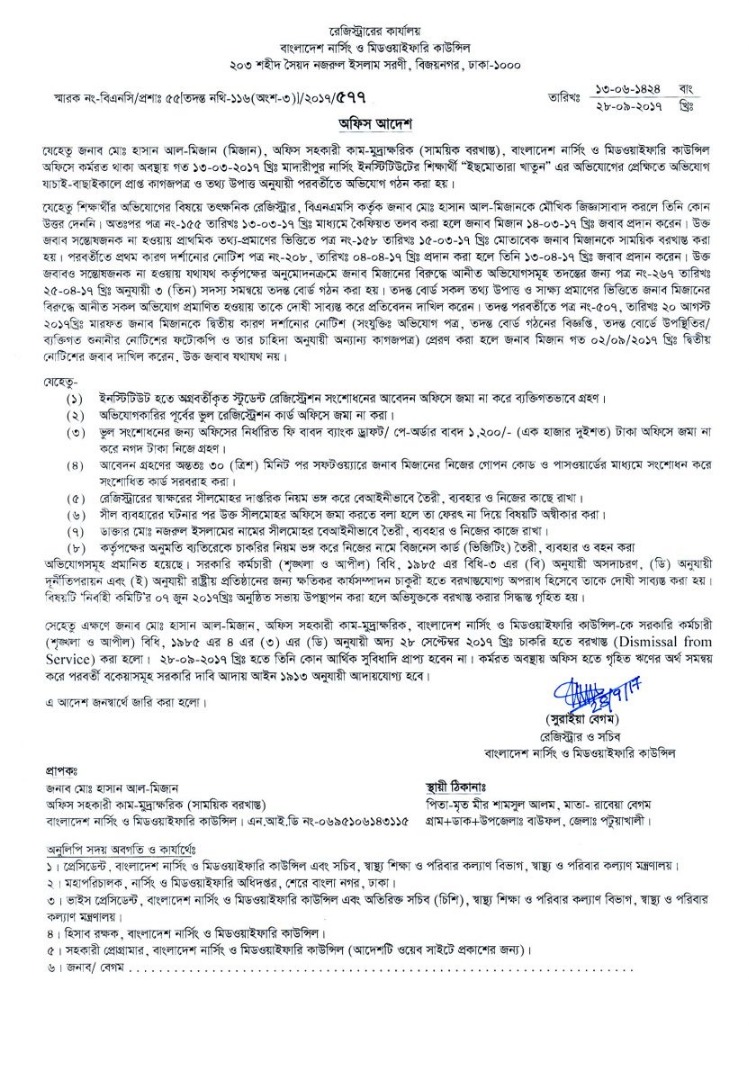 | ২৯ সেপ্টেম্বর ২০১৭ | মো: হাসান আল-মিজান (অফিস সহকারী-বাংলাদেশ নার্সিং ও মিডওয়াইফারি কাউন্সিল) এর বরখাস্ত সংক্রান্ত নোটিশ | ৫৭৭ | ![]() |