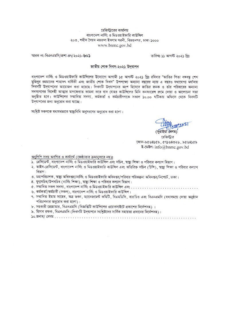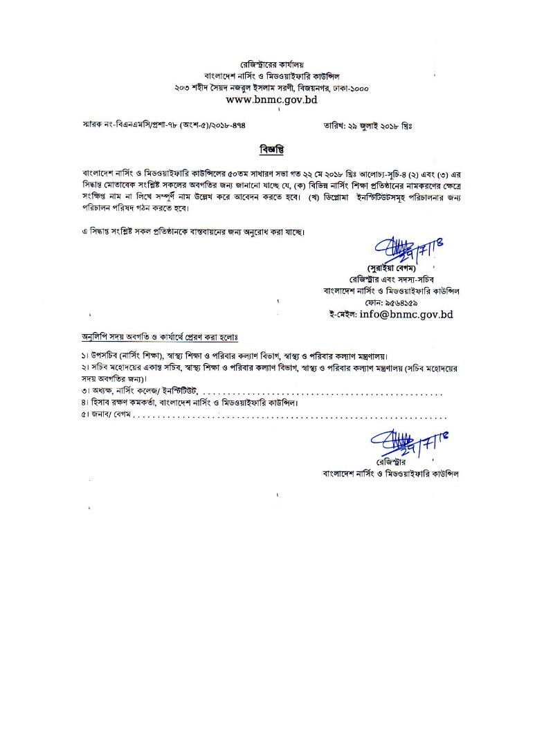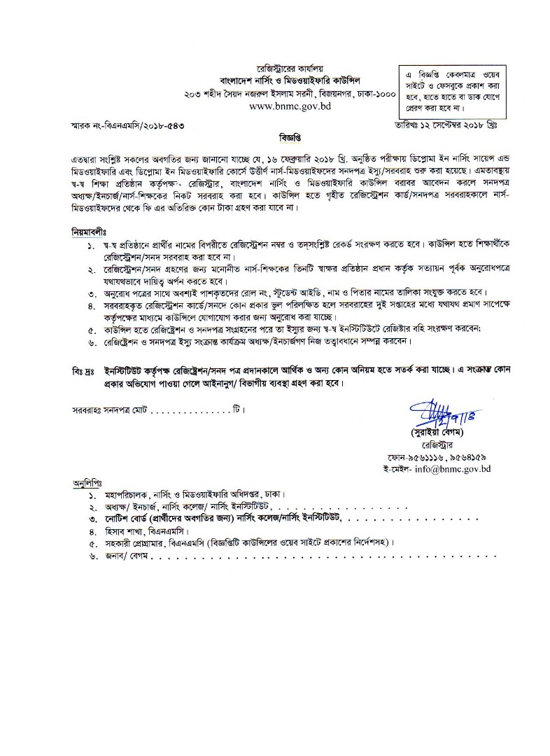 | ১১ ডিসেম্বর ২০১৬ | বাংলাদেশ নার্সিং ও মিডওয়াইফারি কাউন্সিলের অধিনে ডিপ্লোমা ইন-মিডওয়াইফারি কোর্সের প্রথম ব্যাচ কম্প্রিহেন্সিভ পরীক্ষার সার্টিফিকেট বিতরন সংক্রান্ত নোটিশ | Link | |