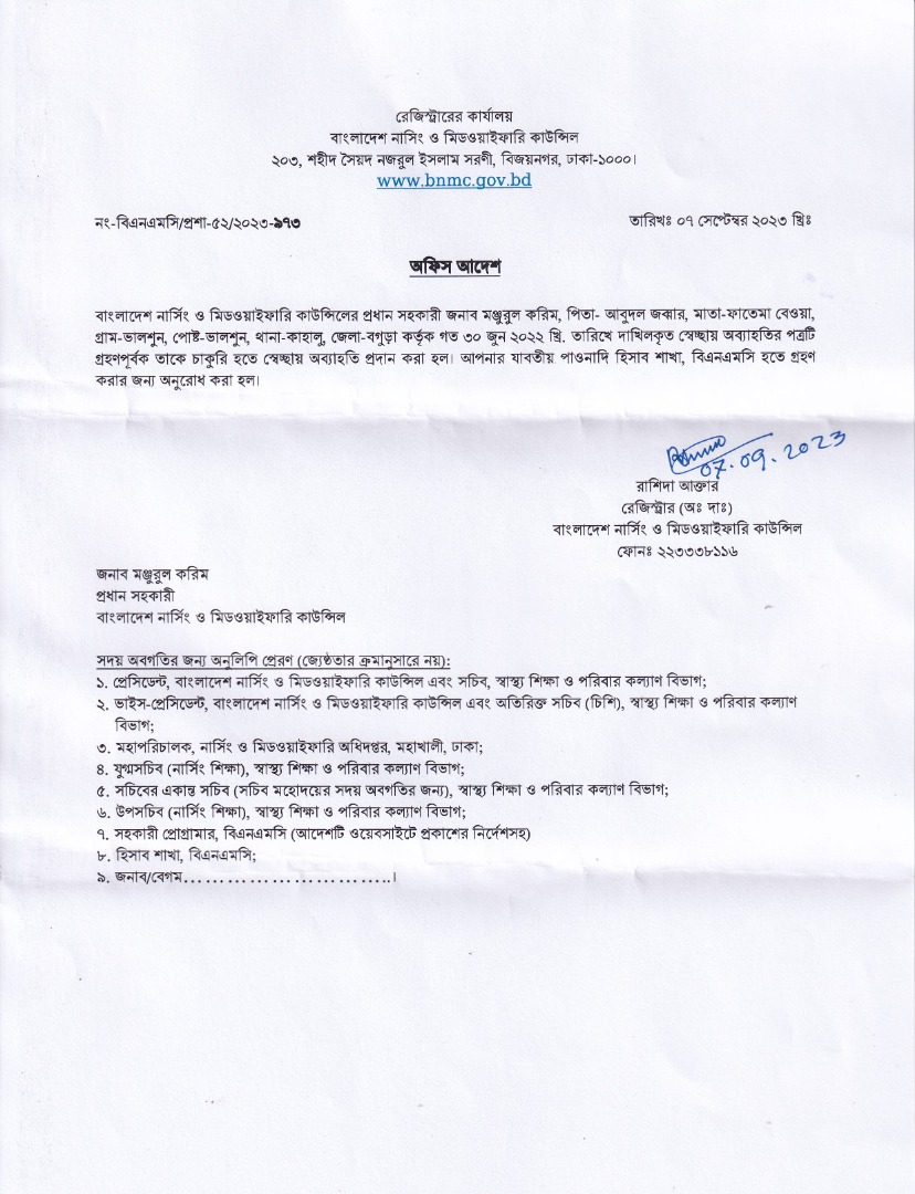 | ০৭ আগস্ট ২০২৩ | জনাব মঞ্জুরুল করিম, প্রধান সহকারী, বিএনএমসি এর সেচ্ছায় অবসর গ্রহন সংক্রান্ত | ৯৭৩ | ![]() |