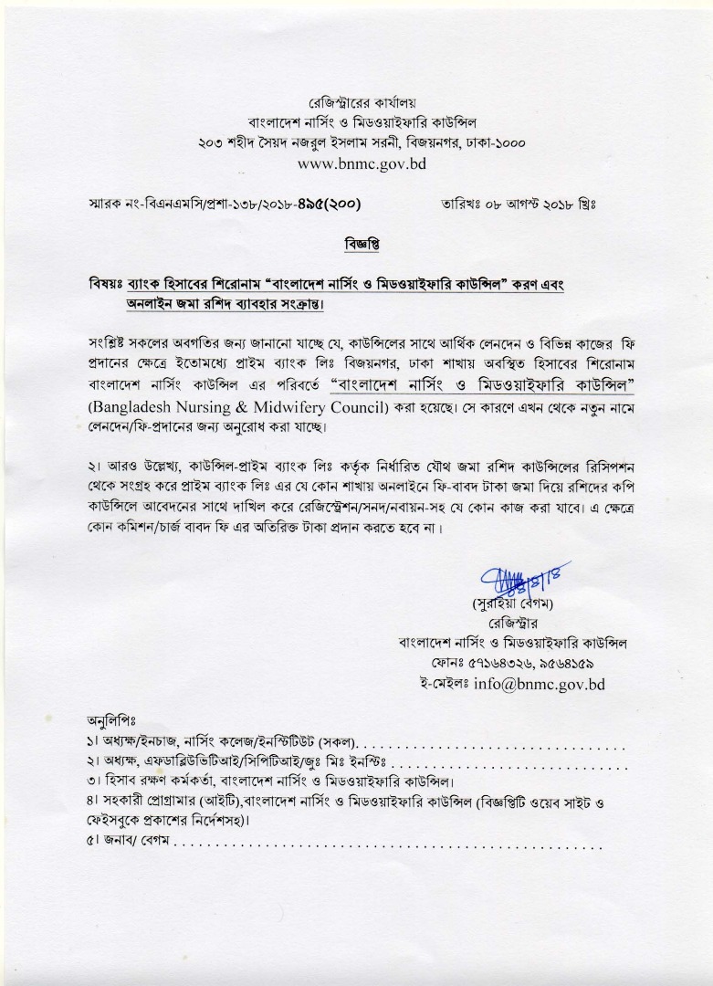 | ০৮ আগস্ট ২০১৮ | বাংলাদেশ নার্সিং ও মিডওয়াইফারি কাউন্সিলের ব্যাংক একাউন্ট নাম পরিবর্তন ও ফি অনলাইন ব্যাংকিং মাধ্যমে প্রদান করা সংক্রান্ত বিজ্ঞপ্তি | ৪৯৫ | ![]() ![]() |