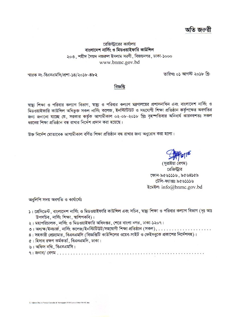 | ০১ আগস্ট ২০১৮ | জরুরী বিজ্ঞপ্তি: এতদ্বারা স্বাস্থ্য শিক্ষা ও পরিবার কল্যাণ বিভাগ, স্বাপকম নিয়ন্ত্রিত এবং বাংলাদেশ নার্সিং ও মিডওয়াইফারি কাউন্সিল অধিভুক্ত সকল শিক্ষা প্রতিষ্ঠান আগামী ০২ আগস্ট ২০১৮ইং রোজ বৃহস্পতিবার বিশেষ ছুটি ঘোষনা করা হল। | ৪৮২ | ![]() |