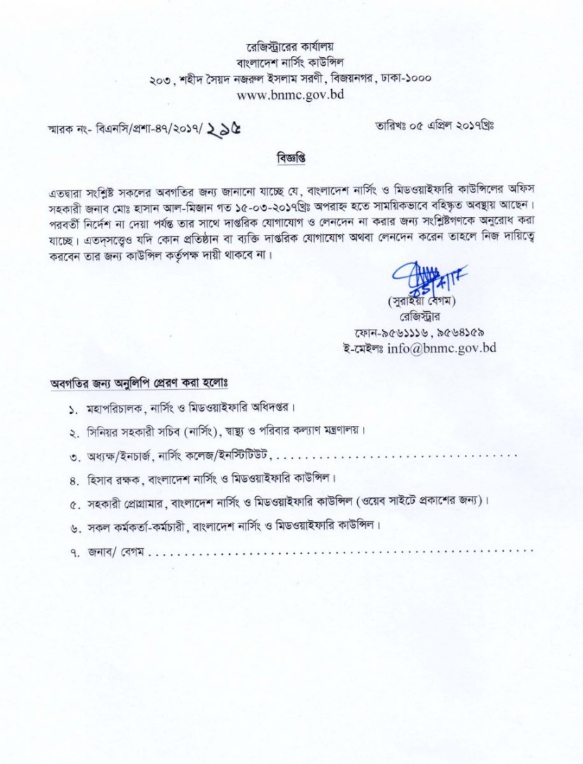 | ০৫ এপ্রিল ২০১৭ | মো: হাসান আল-মিজান (অফিস সহকারী-বাংলাদেশ নার্সিং ও মিডওয়াইফারি কাউন্সিল) এর সাময়িক বরখাস্ত সংক্রান্ত নোটিশ | ২১৫ |
