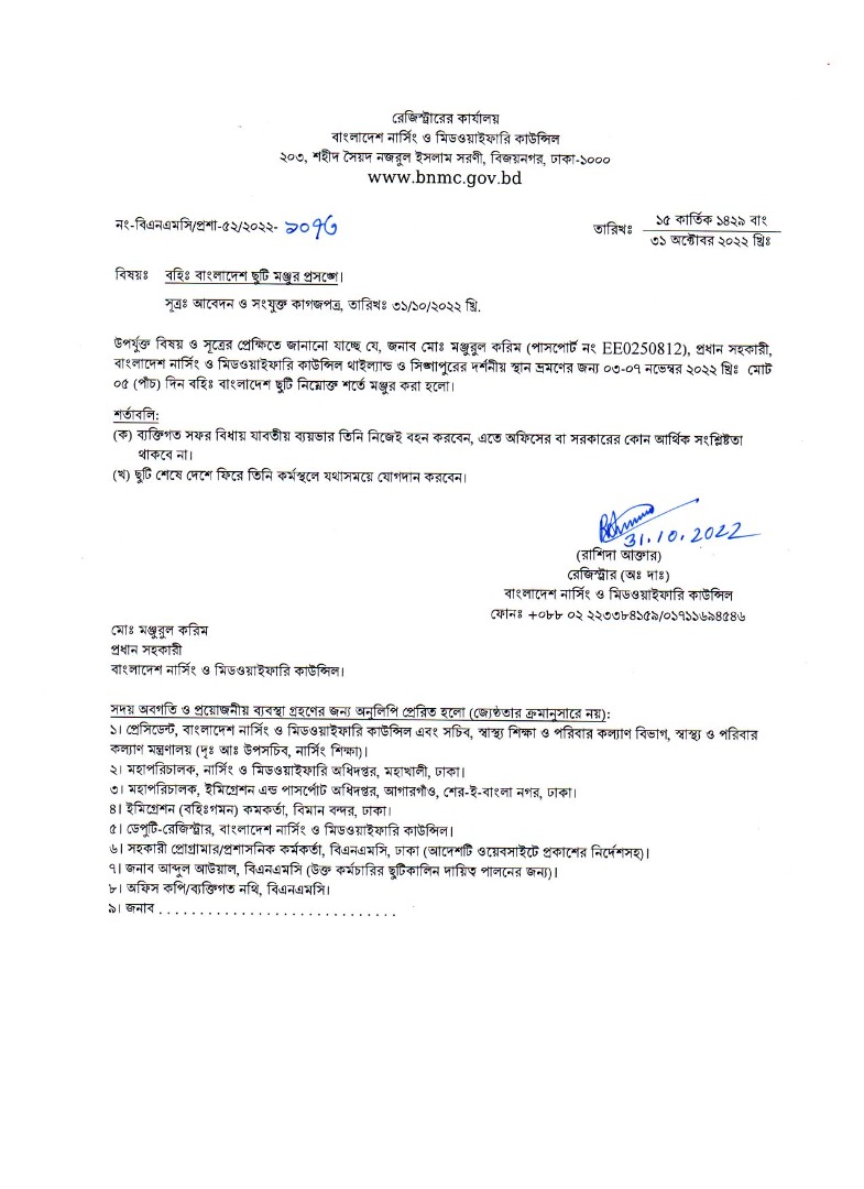 | ৩১ অক্টোবর ২০২২ | জনাব মনজুরুল করিমের, প্রধান সহকারী, বিএনএমসি বহিঃবাংলাদেশ ভ্রমণাদেশ | ![]() | |