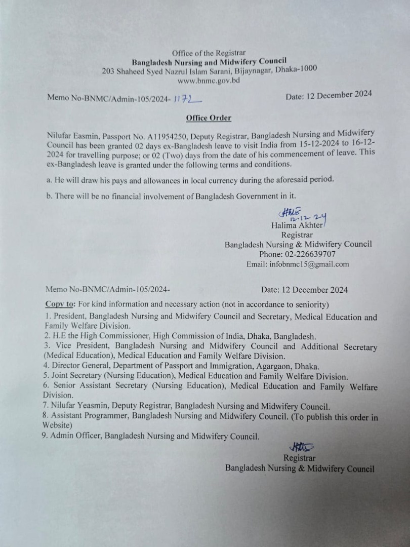 | ১৭ নভেম্বর ২০২৫ | জনাব নিলুফার ইয়াসমিন, ডেপুটি রেজিস্ট্রার, বিএনএমসি'র বহিঃবাংলাদেশ ছুটির আদেশ | ![]() | |