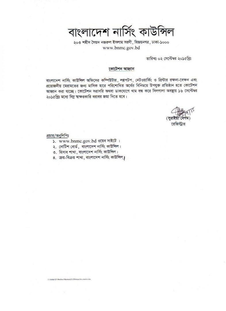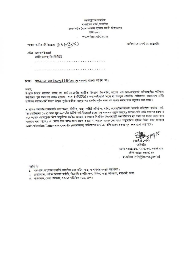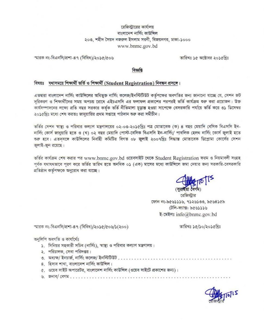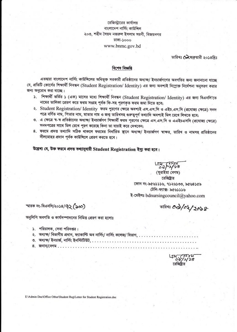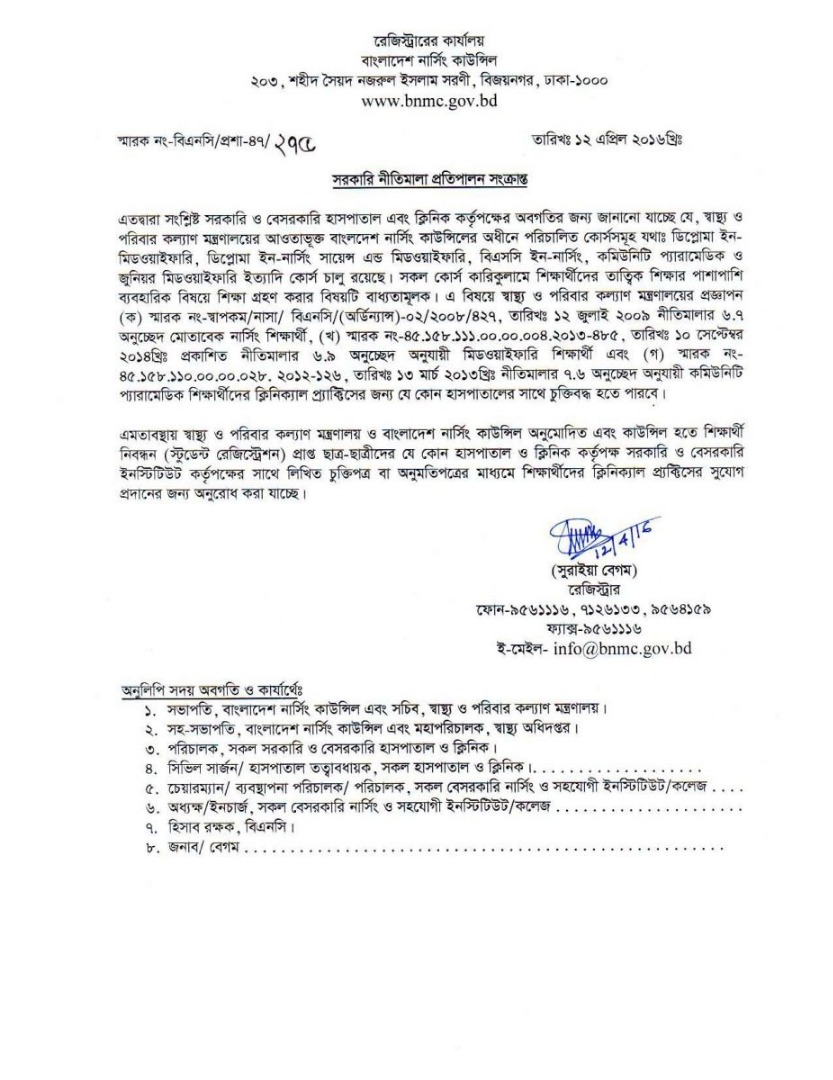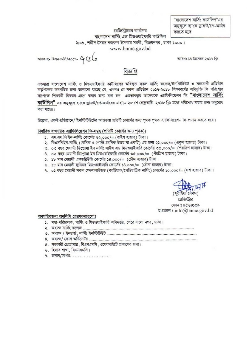| 13 July 2016 | বাংলাদেশ নার্সিং কাউন্সিলের অধিভুক্ত বেসরকারি নার্সিং ও মিডওয়াইফারি ইনস্টিটিউটে অধ্যয়নরত ছাত্র-ছাত্রীদের নিকট হতে ফি নেওয়া সংক্রান্ত বিজ্ঞপ্তি: | 440 |  |