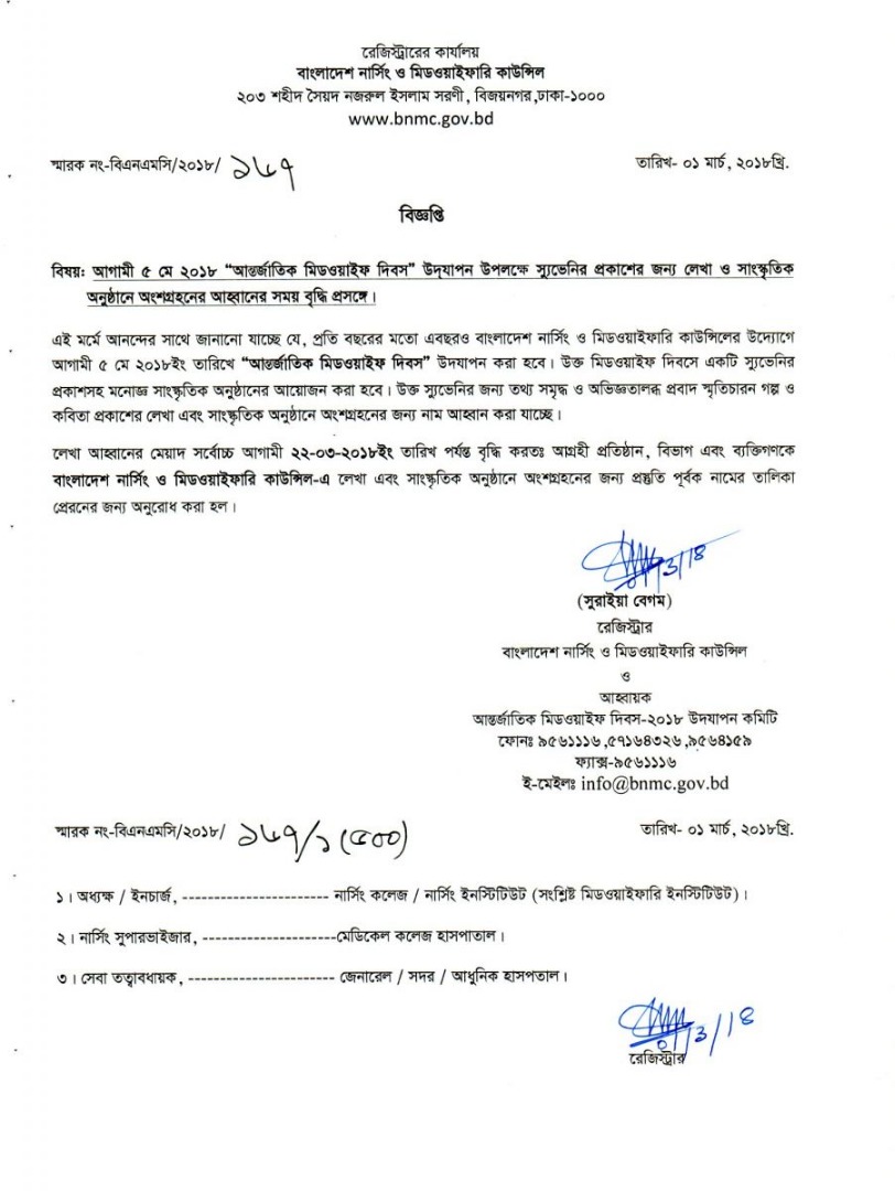 | ০১ মার্চ ২০১৮ | "আন্তর্জাতিক মিডওয়াইফ দিবস" উদযাপন উপলক্ষে স্যুভেনির প্রকাশের জন্য লেখা ও সাংস্কৃতিক অনুষ্ঠানের অংশগ্রহণের জন্য আহবানের সময় বৃদ্ধি প্রসঙ্গে | ১৬৭ |  |