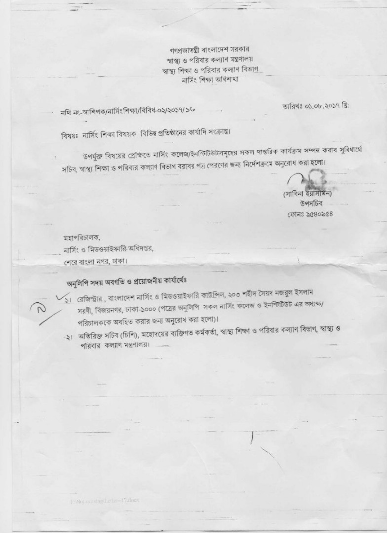 | ০১ আগস্ট ২০১৭ | নার্সিং শিক্ষা বিষয়ক বিভিন্ন প্রতিষ্ঠানের কার্যাদি সংক্রান্ত | MoHFW-13 |  |