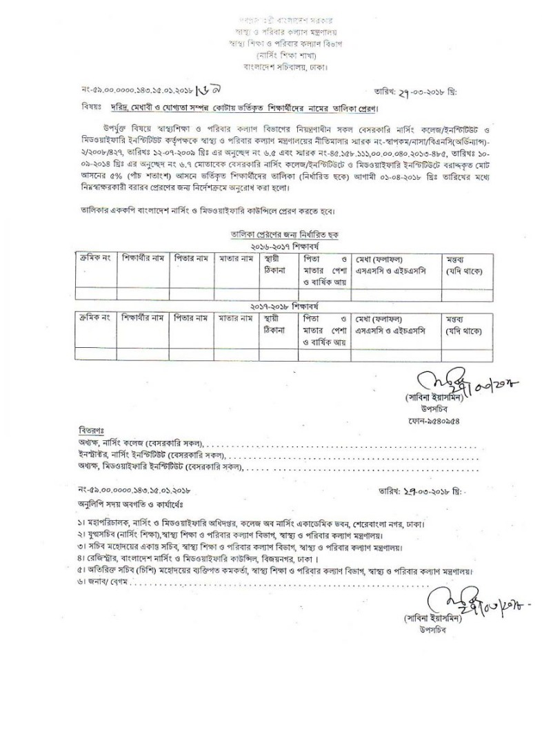 | ২৯ মার্চ ২০১৮ | দরিদ্র, মেধাবী ও যোগ্যতাসম্পন্ন কোটায় ভর্তিকৃত শিক্ষার্থীদের নামের তালিকা প্রেরণ প্রসংগে। | MoHFW- 69 |  |