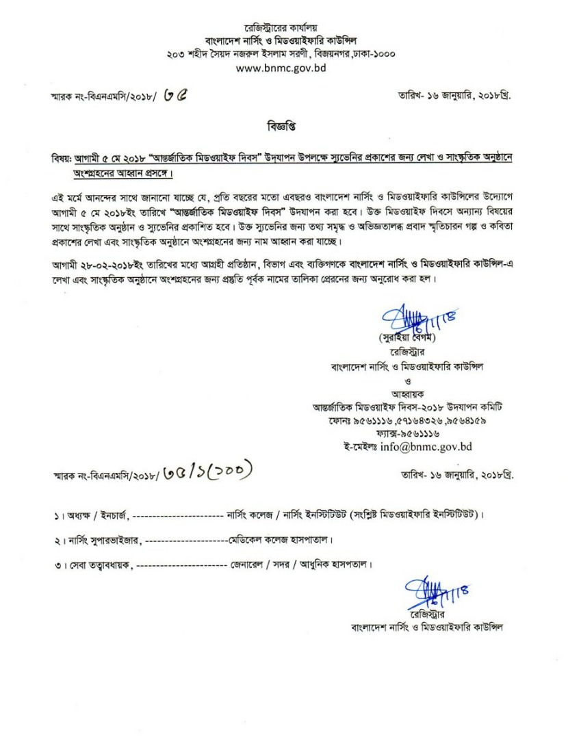 | ১৬ জানুয়ারি ২০১৮ | "আন্তর্জাতিক মিডওয়াইফ দিবস" উদযাপন উপলক্ষে স্যুভেনির প্রকাশের জন্য লেখা ও সাংস্কৃতিক অনুষ্ঠানের অংশগ্রহণের জন্য আহবান প্রসঙ্গে | ৩৫ |  |