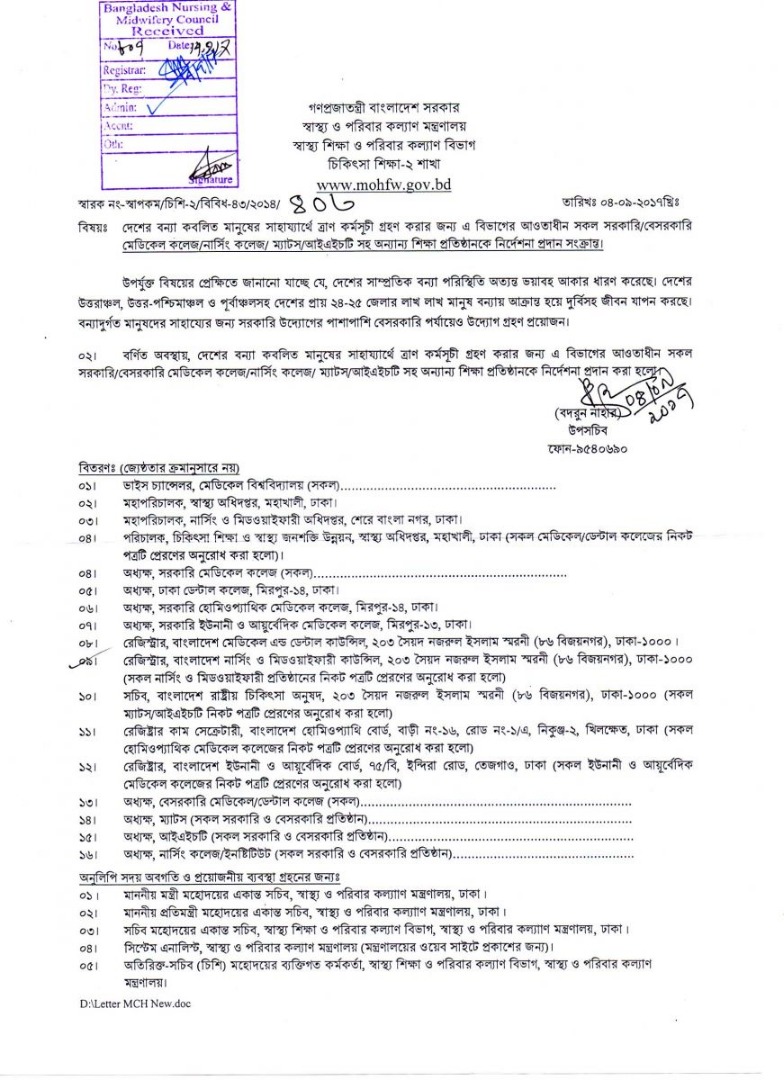 | ০৪ সেপ্টেম্বর ২০১৭ | দেশের বন্যাকবলিত মানুষের সাহায্যার্থে ত্রান কর্মসুচী গ্রহন করার এ বিভাগের আওতাধীন সকল সরকারি/বেসরকারি মেডিকেল কলেজ/নার্সিং কলেজ/ম্যাটস/আইএইচটি সহ সকল প্রতিষ্ঠানকে দেওয়া নির্দেশনা সংক্রান্ত বিজ্ঞপ্তি | MoHFW-403 |  |