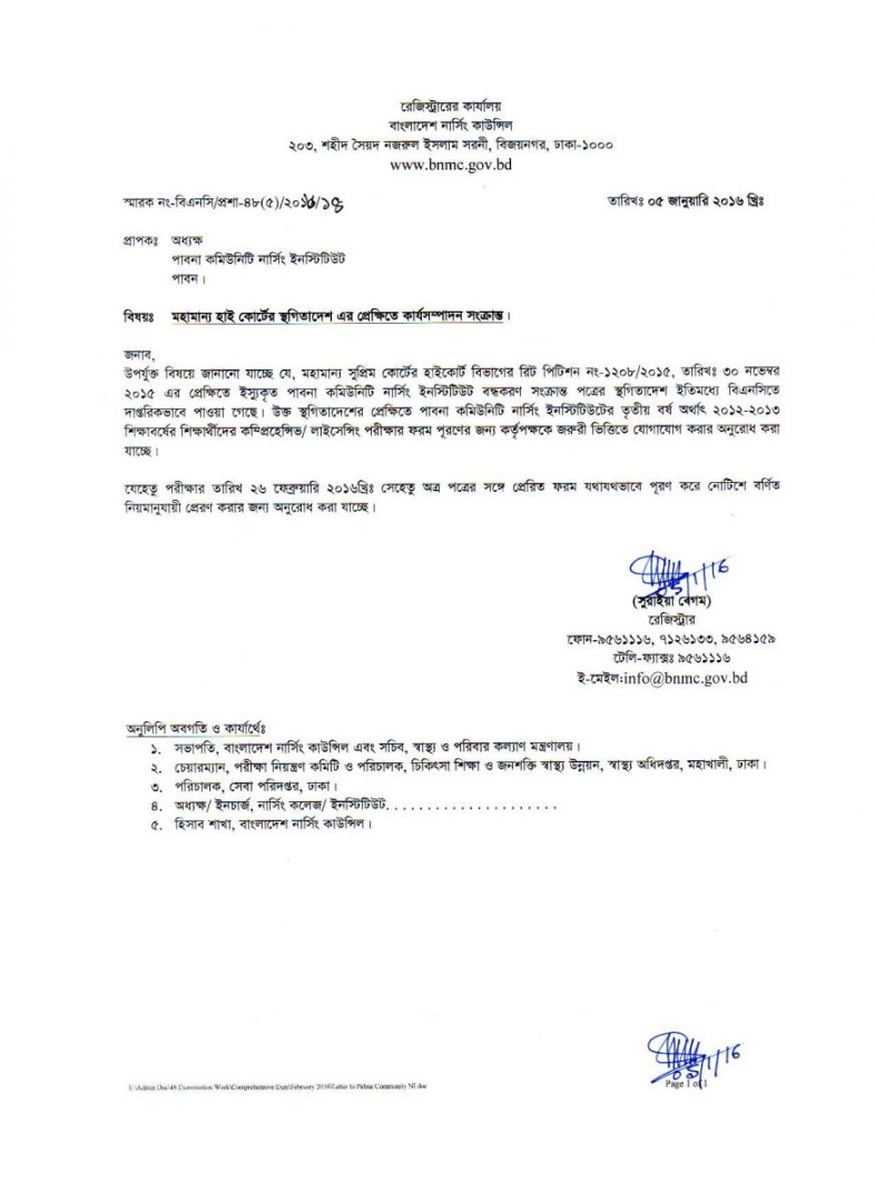 | 05 January 2016 | পাবনা কমিউনিটি নার্সিং ইনস্টিটিউট এর বিষয়ে মহামান্য হাইকোর্টের স্থগিতাদেশ এর প্রেক্ষিতে কার্যসম্পাদন সংক্রান্ত পত্র | 14 |  |