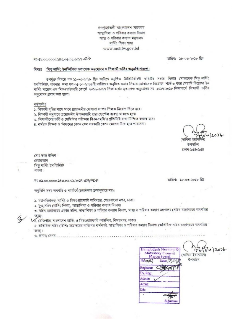 | ১৮ মার্চ ২০১৮ | মিতু নার্সিং ইনস্টিটিউট, পাবনার অনুমোদন পত্র | MoHFW- 59 |  |